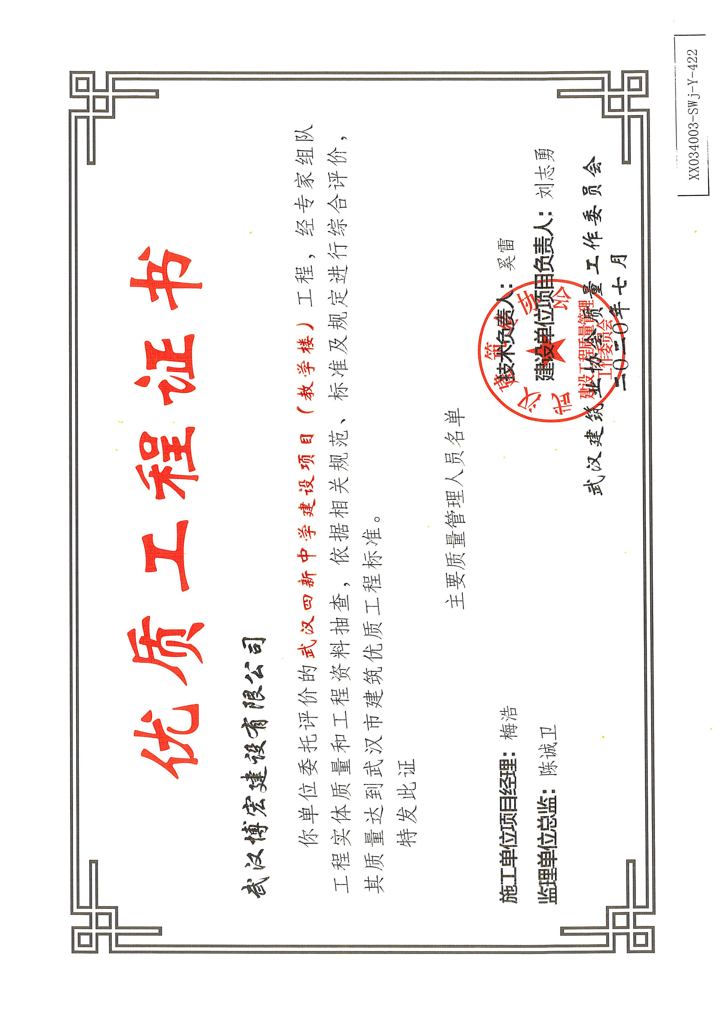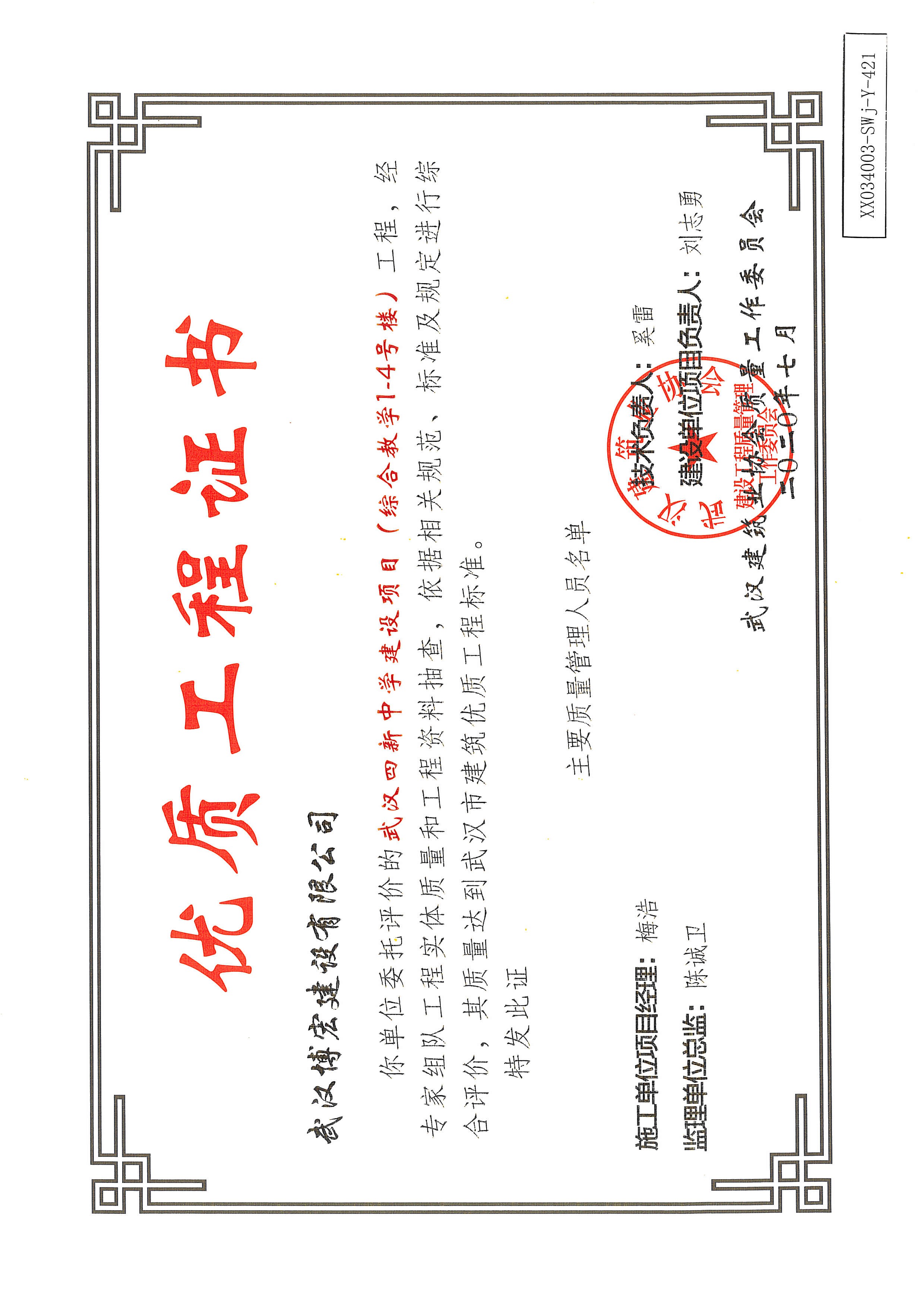優(yōu)質工程證書(武漢四新中學建設項目工程(綜合教學1--4號樓)