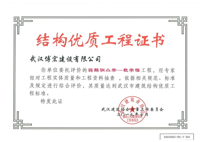 結構優(yōu)質工程證書(鸚鵡洲小學教學樓)