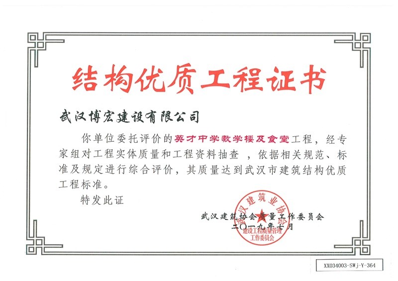 結構優(yōu)質工程證書(英才中學教學樓及食堂)