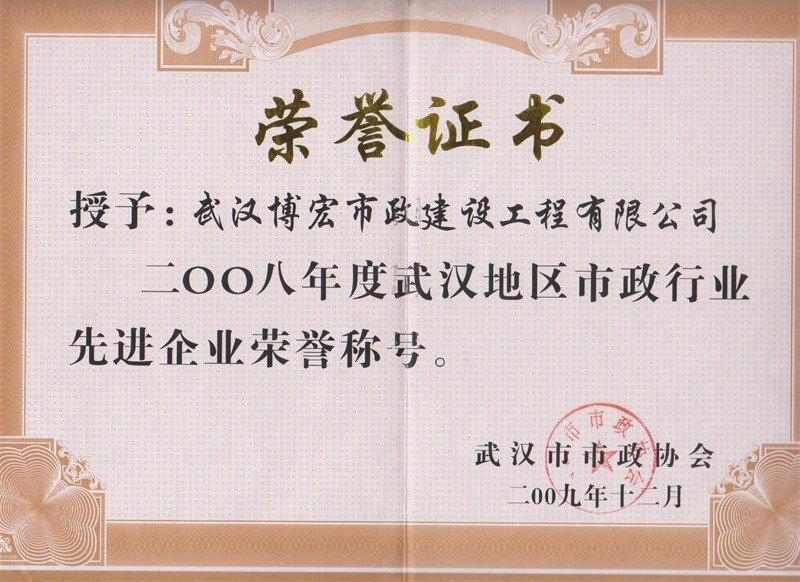 2008年度武漢地區(qū)市政行業(yè)先進企業(yè)榮譽稱號