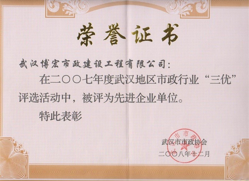 2007年度武漢地區(qū)市政行業(yè)三優(yōu)先進企業(yè)單位