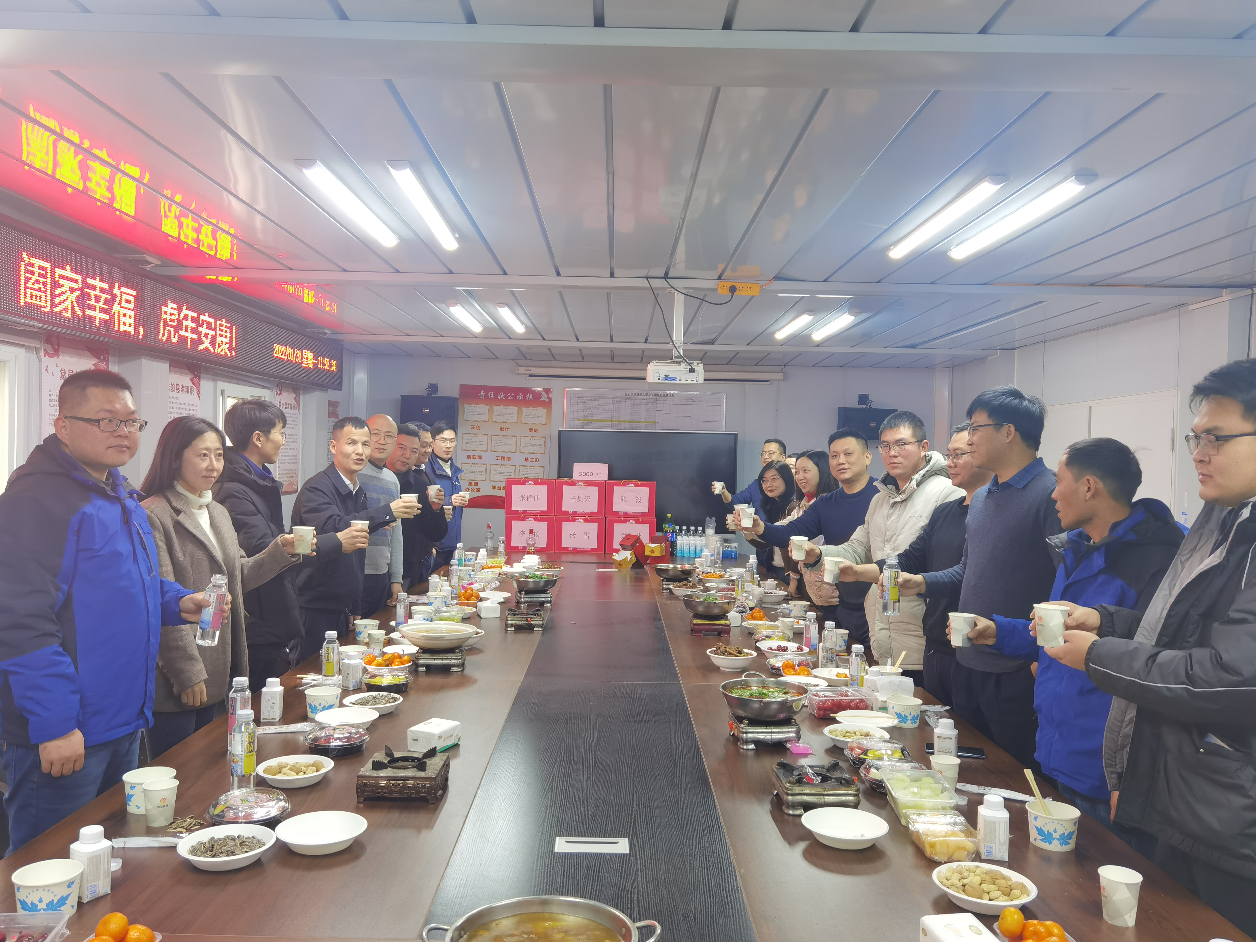 1月31日中午,在除夕這個(gè)特別的日子,在漢陽(yáng)市政建設(shè)大廈項(xiàng)目部,公司就地過年以及在工地值守的職工圍坐在桌邊,吃了一頓熱乎乎的團(tuán)圓飯,陪他們一起吃團(tuán)圓飯的,還有公司黨支部書記、董事長(zhǎng)鄒勇,總經(jīng)理蘇琦,黨支部副書記、工會(huì)主席郭一清,副總經(jīng)理奚雷、辛桂華以及總經(jīng)理助理周昌文、王哲、李磊等領(lǐng)導(dǎo)一行。飯桌前,大家如同一家人一起聊聊家常、看看電視,共度美好的除夕佳節(jié)。