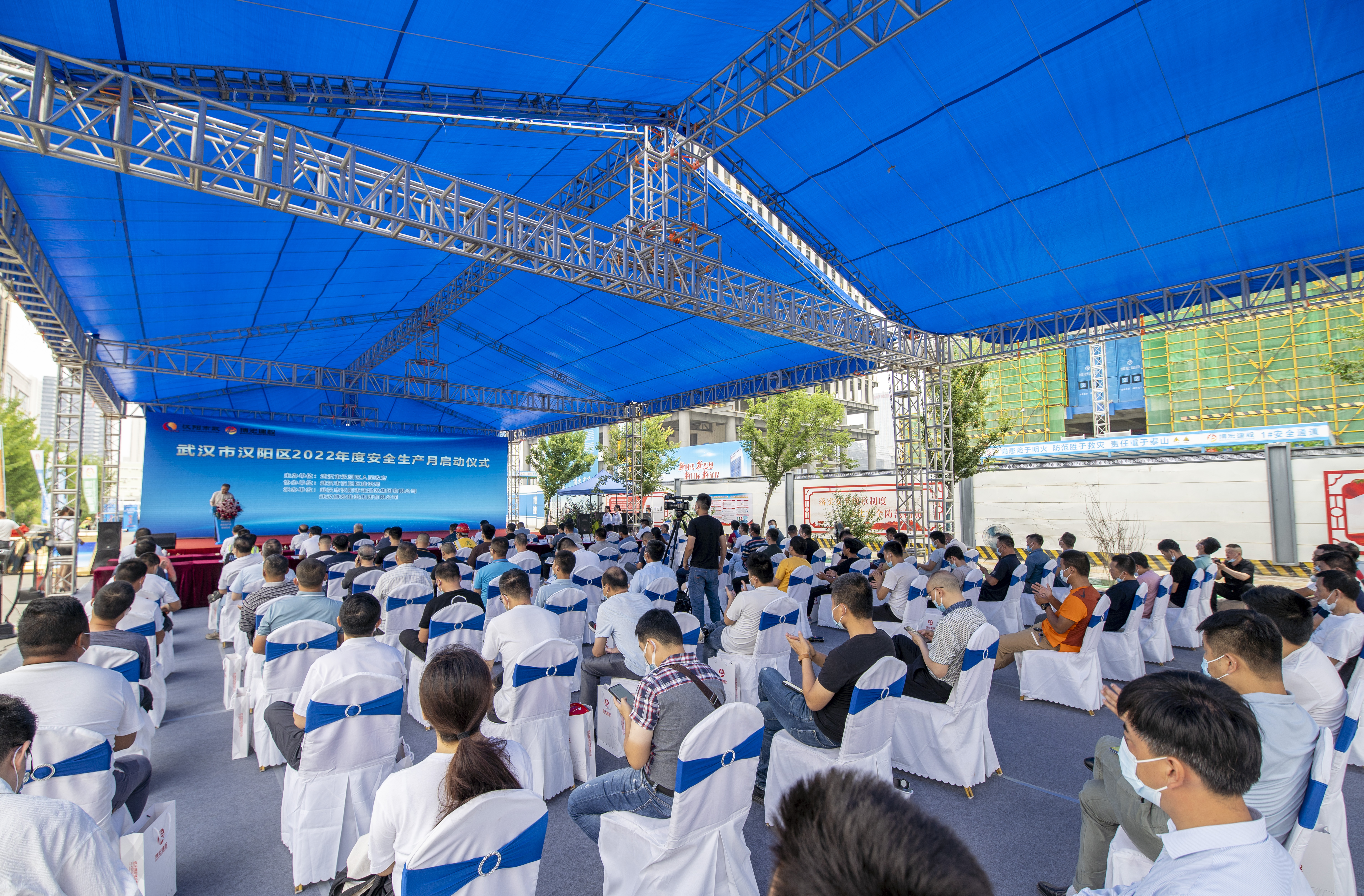 5月30日上午9時,武漢市漢陽區(qū)2022年度“安全生產(chǎn)月”啟動儀式在博宏建設(shè)集團(tuán)承建的中南科研設(shè)計中心項目舉行。武漢市城建局副局長周才志,漢陽區(qū)政府副區(qū)長李津,武漢市城建局質(zhì)安處副處長宋鈺、安全站副站長汪仁平,漢陽區(qū)建設(shè)局局長胡紅勝、區(qū)應(yīng)急局局長李漢光、龍陽街主任肖瀟、區(qū)建管站站長王晟,漢陽市政黨委書記、董事長嚴(yán)悌文,武漢創(chuàng)設(shè)科技發(fā)展有限公司董事長周忠義,博宏建設(shè)集團(tuán)黨支部書記、董事長、總經(jīng)理鄒勇,中南科研中心項目建設(shè)單位、監(jiān)理單位、參建單位、在建項目代表等參加了活動。