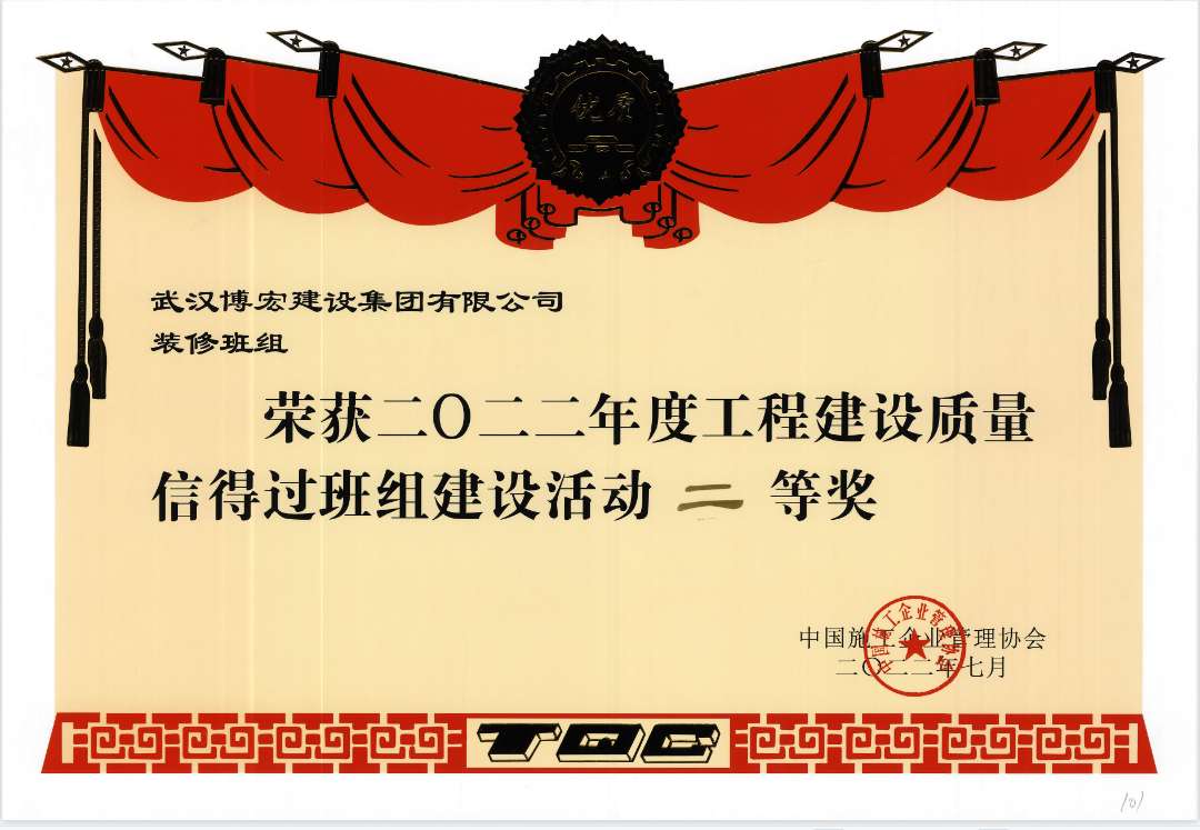 近日,博宏建設集團裝修分公司榮獲中國施工企業(yè)管理協(xié)會頒發(fā)的2022年度工程建設質(zhì)量“信得過班組”建設活動“二等獎”以品質(zhì)工程,打造博宏品牌。
