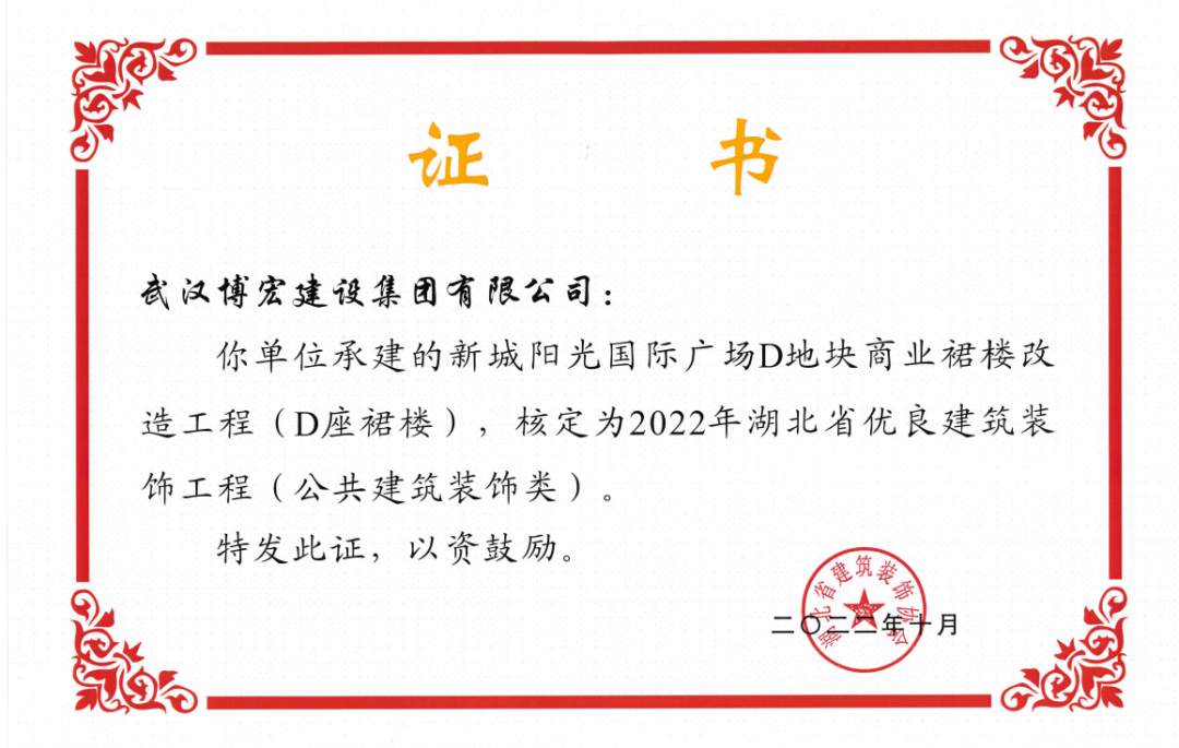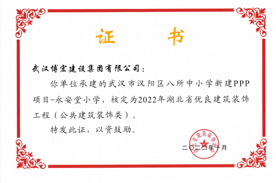 近日,湖北省建筑裝飾協(xié)會發(fā)布了《關于開展2022年湖北省建筑裝飾工程質量目標考核工作的通知》,由博宏建設集團承建的華發(fā)四季等5所幼兒園裝修工程(EPC)、新城陽光國際廣場C地塊商業(yè)裙樓改造工程(1#、2#裙樓)、新城陽光國際廣場D地塊商業(yè)裙樓改造工程(D座裙樓)、武漢市漢陽區(qū)八所中小學新建PPP項目-永安堂小學被核定為“2022年湖北省優(yōu)良建筑裝飾工程(公共建筑裝飾類)”。