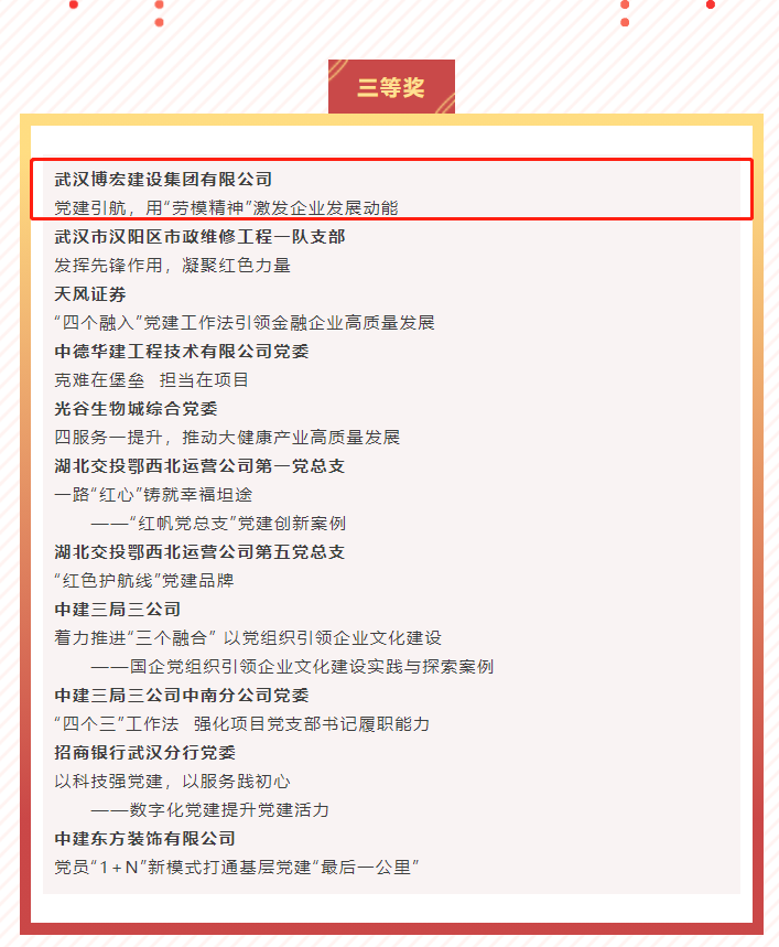 ? ? ? ?近日,首屆新時(shí)代企業(yè)黨建創(chuàng)新案例獲獎(jiǎng)名單公布,由博宏建設(shè)集團(tuán)推送的《黨建引航,用“勞模精神”激發(fā)企業(yè)發(fā)展動(dòng)能》品牌案例斬獲黨建優(yōu)秀案例三等獎(jiǎng)。?該項(xiàng)活動(dòng)由湖北省新時(shí)代文明實(shí)踐研究院、華中科技大學(xué)馬克思主義學(xué)院、華中科技大學(xué)黨的建設(shè)研究中心聯(lián)合紅艦智庫等機(jī)構(gòu)共同發(fā)起,博宏建設(shè)集團(tuán)推送的品牌案例在百余項(xiàng)案例中脫穎而出。