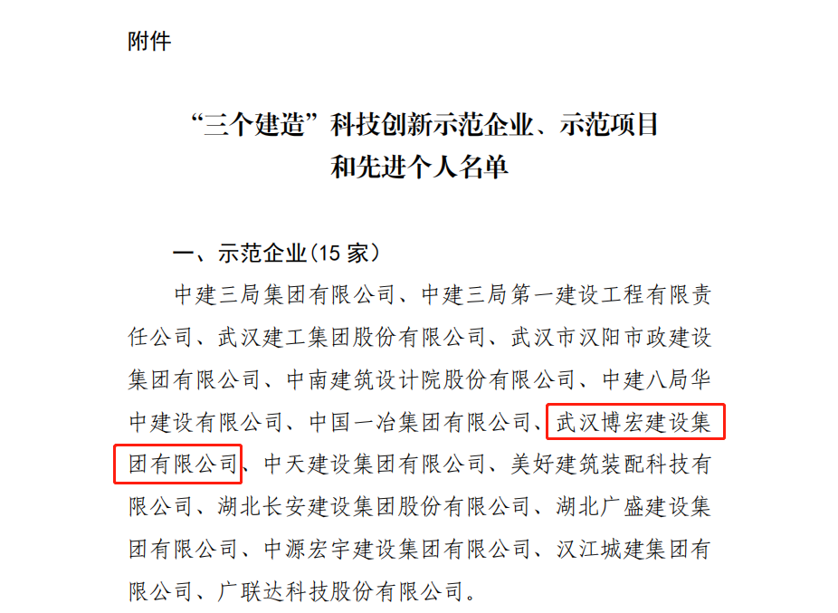 12月28日湖北省住房和城鄉(xiāng)建設廳發(fā)布關于綠色建造智能建造品質(zhì)建造科技創(chuàng)新工作情況的通報,博宏建設集團入選“三個建造”科技創(chuàng)新示范企業(yè);漢陽市政建設大廈(一標段)、新建商務服務與設施項目(中南科研設計中心)項目入選“三個建造”科技創(chuàng)新示范項目;嚴俊、楊云華入選“三個建造”科技創(chuàng)新先進個人。