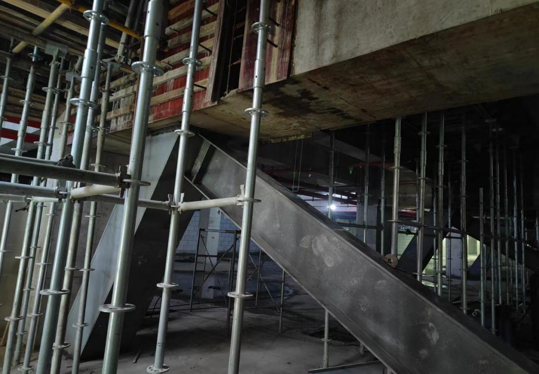 上述人字撐材料為項(xiàng)目副樓東側(cè)拆除懸挑鋼平臺的鋼構(gòu)件進(jìn)行回收利用。施工時(shí)支撐系統(tǒng)搭拆快捷,節(jié)省了人工、鋼管扣件及架體租賃費(fèi)用,有效縮短了工期。該支撐系統(tǒng)具有整體剛度大、穩(wěn)定性好、節(jié)點(diǎn)牢固的特點(diǎn),無論是安裝、拆除都十分方便,靈活性較強(qiáng),極大程度地保證了現(xiàn)場的施工安全。且待結(jié)構(gòu)完成后,人字撐支撐材料可拆卸回收周轉(zhuǎn)利用,創(chuàng)造了良好的環(huán)保、經(jīng)濟(jì)和社會效益。